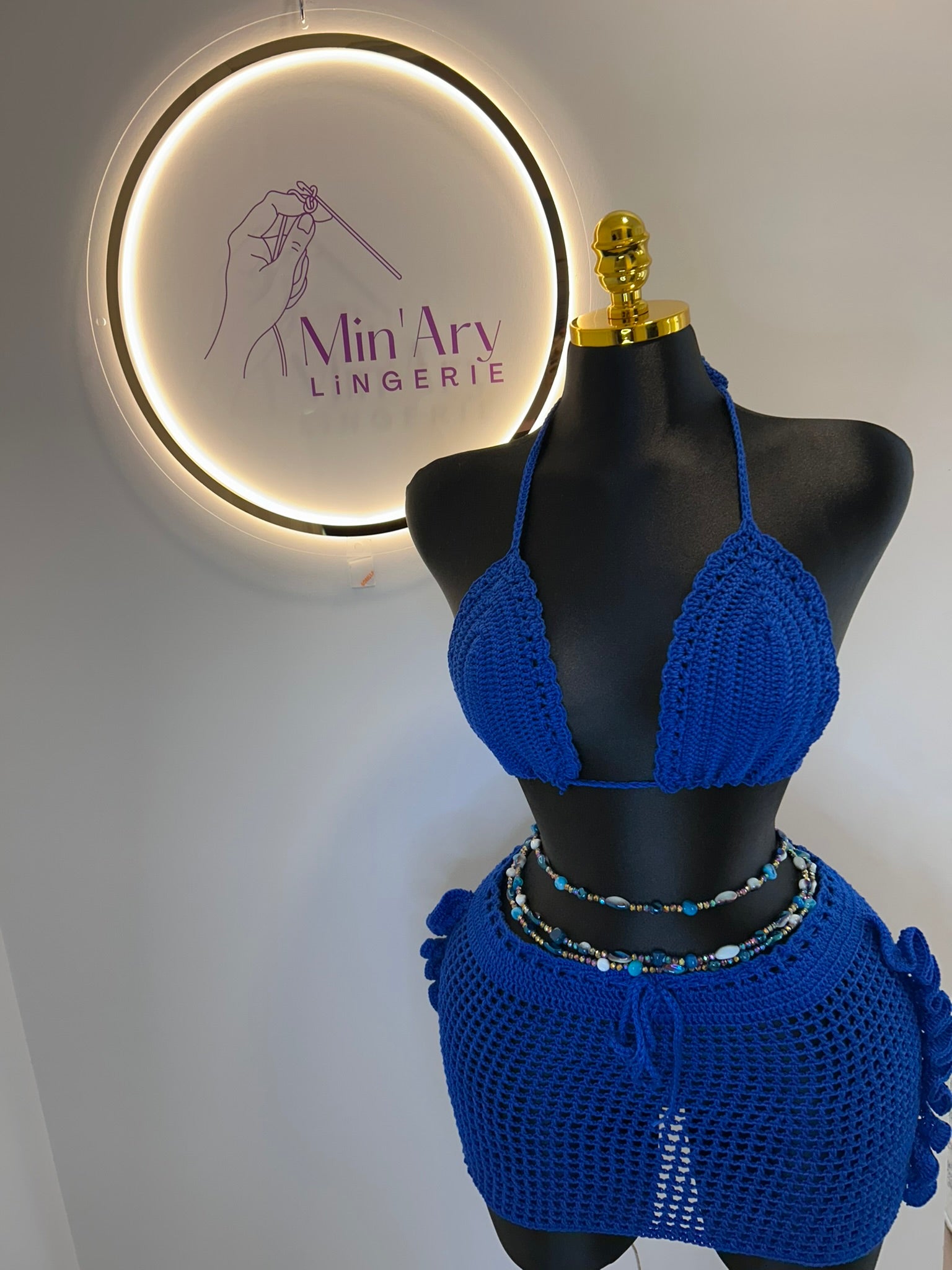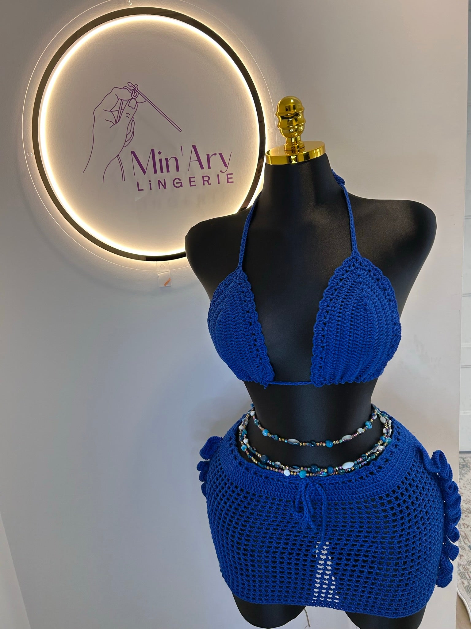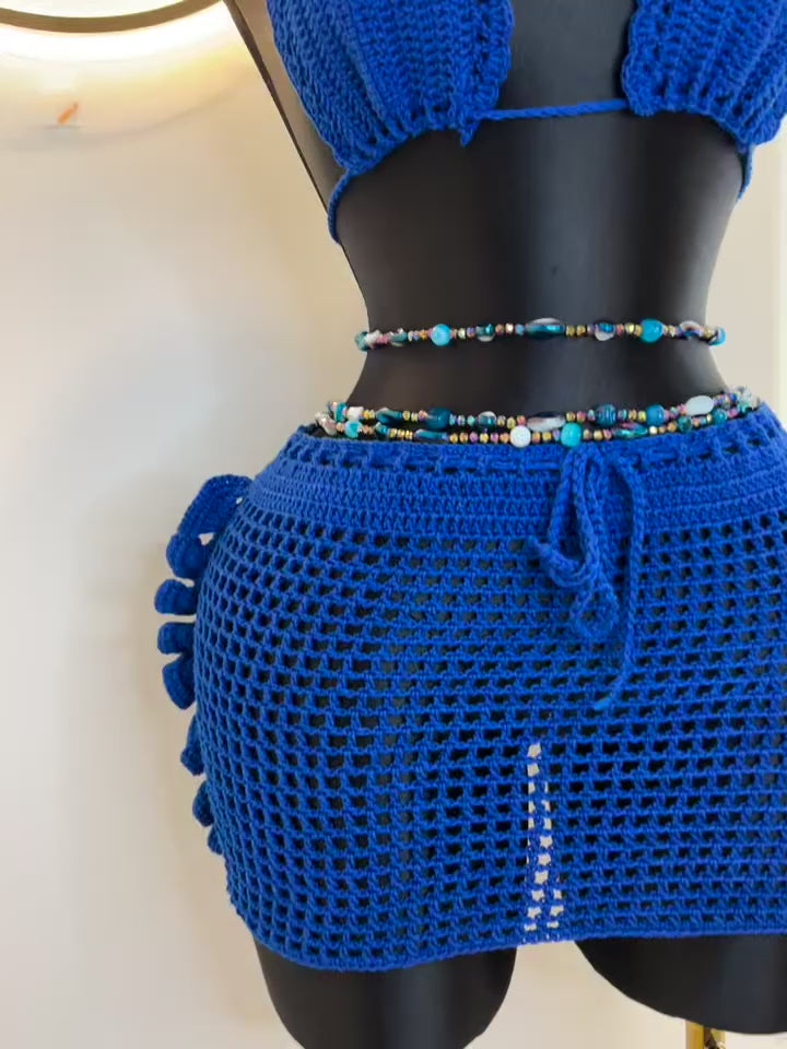 Laissez-vous séduire par Lumia, un ensemble deux pièces tricoté à la main avec du fil de coton de haute qualité. Conçu pour sublimer votre corp avec une touche bohème et raffinée, il se compose de :