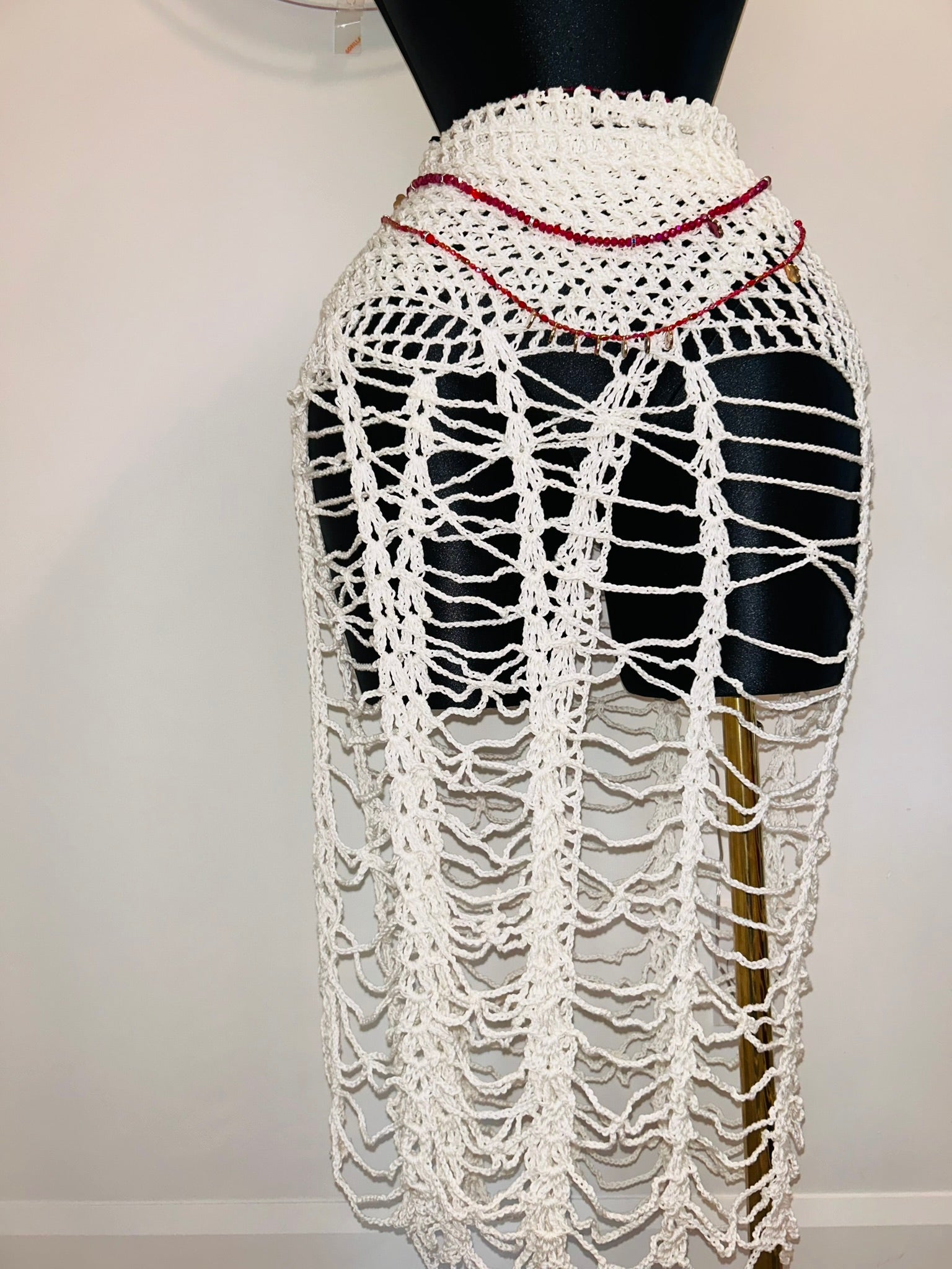 Le Kanga est une pièce signature qui célèbre la finesse du crochet artisanal et la beauté du geste fait main. Conçu comme un pagne moderne et sensuel, il se distingue par son motif ajouré délicat, composé de mailles larges, de boucles sculpturales et d’un jeu de transparence qui sublime chaque mouvement.